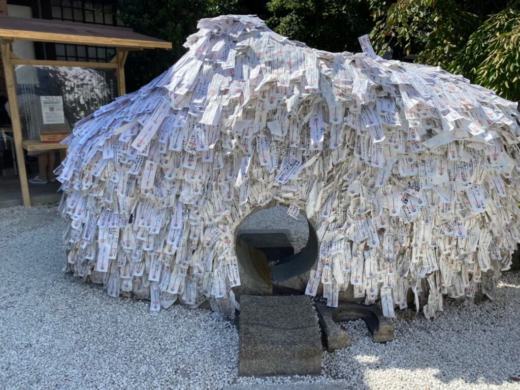 境内の中央にある「縁切り縁結び碑」は、この神社の象徴的存在。願いを念じながら石の穴をくぐり、まず悪縁を断ち、次に良縁を願う――この一連の流れは、ちょっとした儀式のよう。碑にびっしりと貼られた形代には、恋愛だけでなく、仕事や人間関係、生活習慣など、さまざまな願いが込められています。