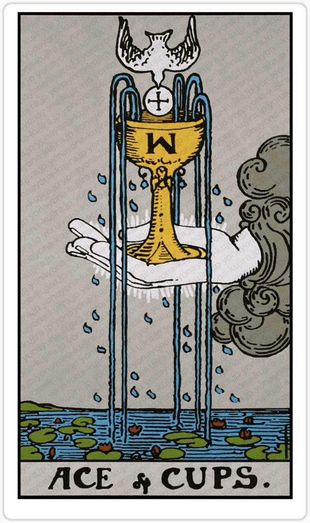 カップのエースは、心の浄化や新しい感情の誕生、希望のエネルギーを象徴するカードです。手に持ったカップからあふれる清らかな水は、私たちの心に新しい喜びや愛、勇気を注ぎ込むイメージがあります。