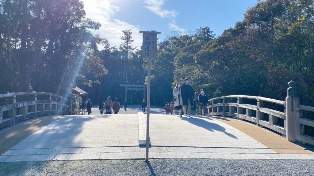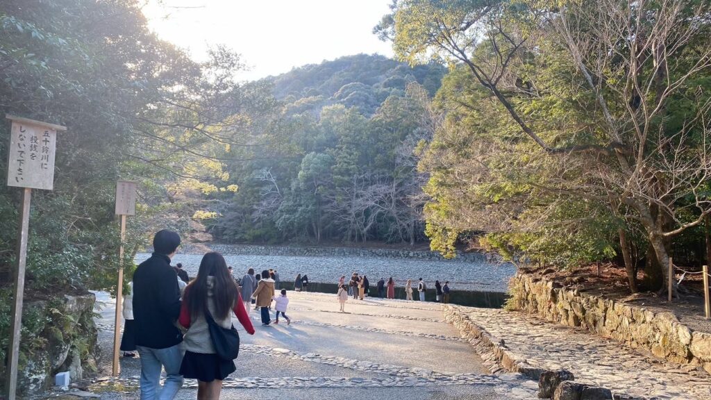 外宮を参拝した後は、バスや車で内宮へ向かいます。内宮へ続く宇治橋を渡ると、そこから先は神聖な空間が広がります。五十鈴川の清らかな流れや、自然豊かな森の景色がとても美しく、歩いているだけでも心が落ち着いていくのを感じられる場所です。内宮の正宮は写真撮影が禁止されているため、実際に訪れてその神秘的な雰囲気を感じることが、この場所の大きな魅力の一つです。