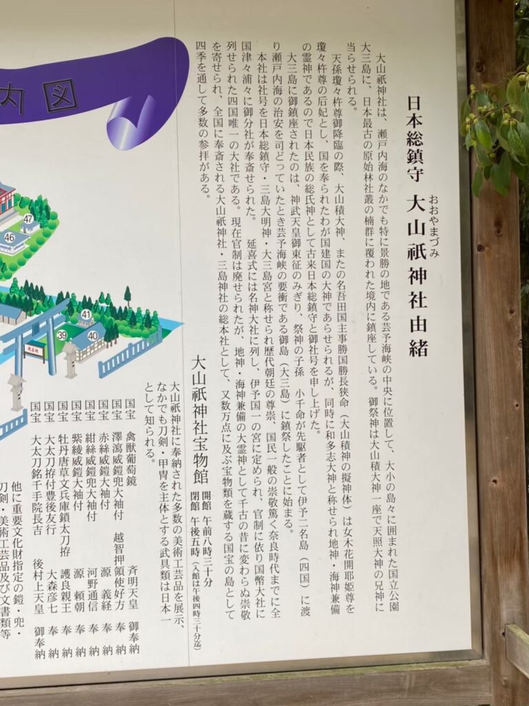 愛媛県今治市の大三島にある大山祇神社は、瀬戸内海の自然に囲まれた歴史ある神社です。古くから「日本総鎮守」とも呼ばれ、全国にある大山祇神社や三島神社の総本社として知られています。