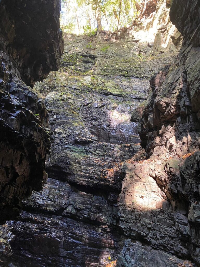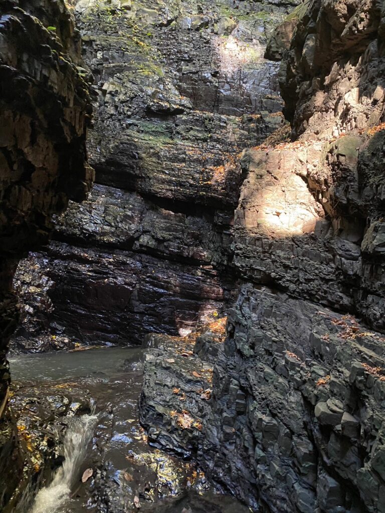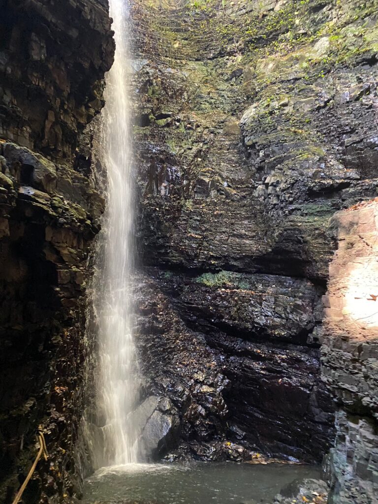 やがて見えてくるのが、岩肌を伝うように静かに流れ落ちる文蔵の滝。大きく豪快な滝ではありませんが、その分、水の一筋一筋がとても繊細で、どこかやわらかい印象を受けます。